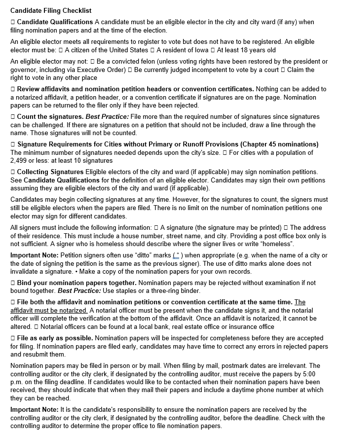 Click here for the Election Checklist, Affidavit of Candidacy and Nomination Petition